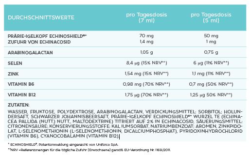 Nahrungsergänzungsmittel mit Echinacea pallida-Extrakt ECHINOSHIELD®, Lärchen-Arabinogalactan Fiberaid®, Zink, Selen und den Vitaminen B6 und B12. Mit Johannisbeer- und Holundersaft.